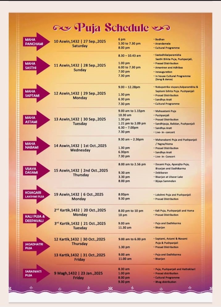 Highlights: Traditional Rituals, Dhunuchi Naach, Dandiya Night, Cultural Programs, Bhog
